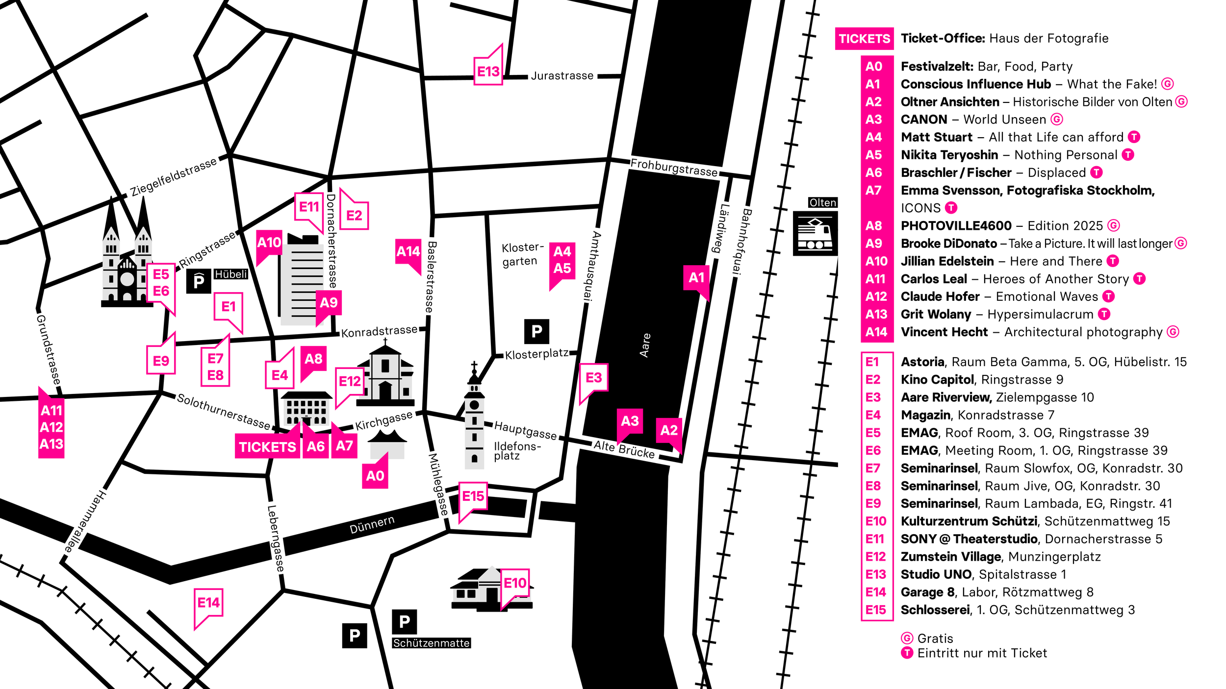 Das Festivalgelände ist zu Fuss in ca. 10 Minuten vom HB Olten erreichbar.